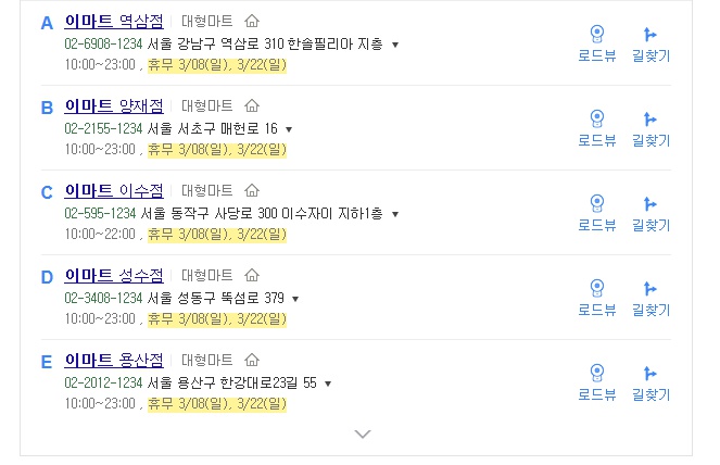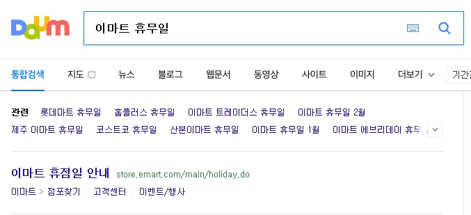 혹여나 경기도 고잔점처럼 그곳의 상황 때문에 다른 휴무일이 부여된 매장들 중에 내가 자주 다니는 매장이 포함되어 있지는 않나 의심이 드신다면 각 매장별로 이마트 휴무일이 어떻게 편성되어 있는지 확인하는 방법을 알려드리도록 하겠습니다. 네이버, 다음을 통해서 ‘이마트OO점’이라고 자신이 애용하는 지역 매장을 검색하시면 지도와 함께 해당 매장의 영업시간, 주소, 휴무일이 나타나는 걸 보실 수 있으실 겁니다.