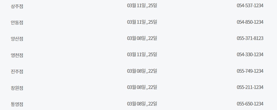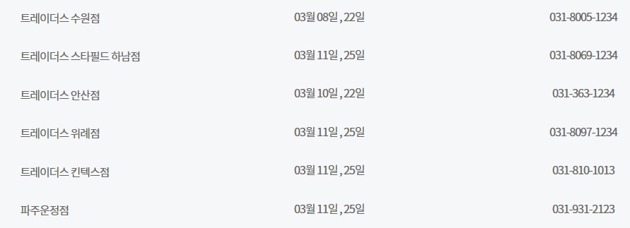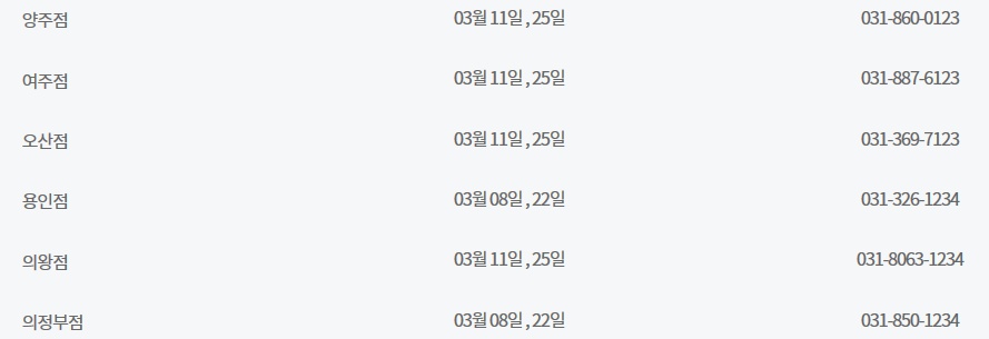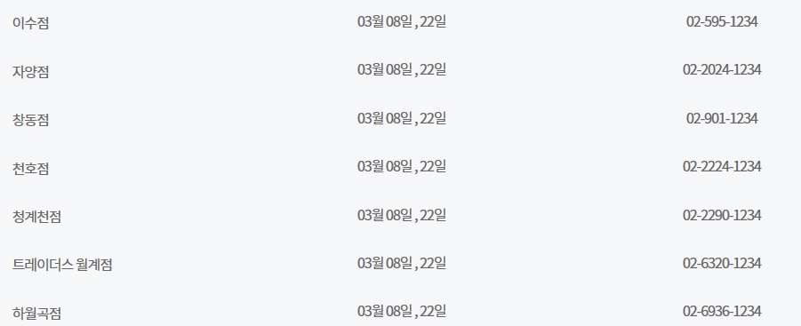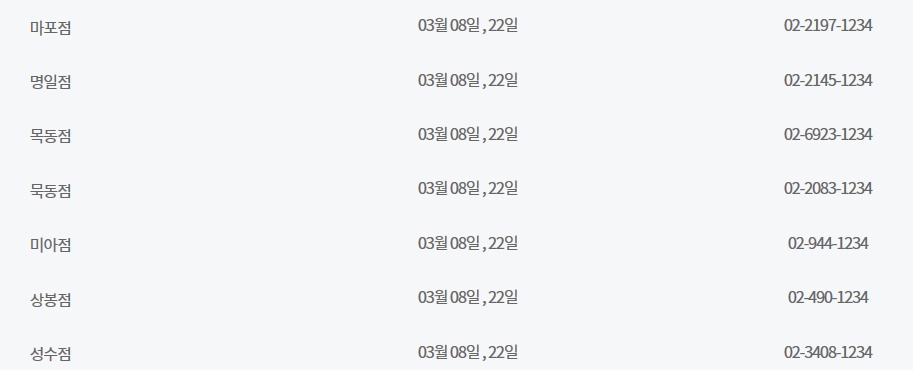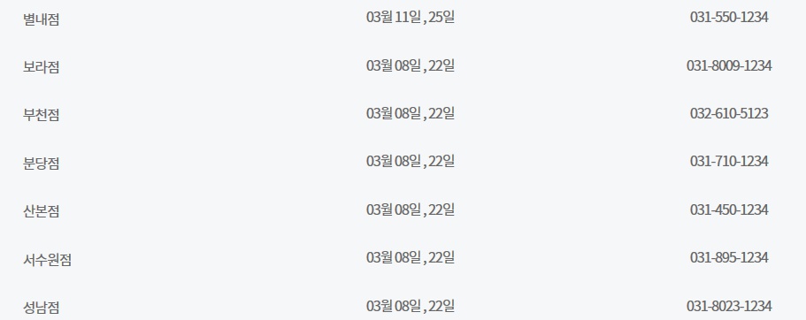 3월 이마트 휴무일은 기본적으로 3월 8일과 3월 22일이지만 많은 수의 매장이 3월 11일과 3월 25일에도 휴무일을 갖고 있습니다. 그러니 자신이 사는 지역, 그리고 자신이 자주 방문하는 매장의 휴무일이 과연 두 케이스 중 어디에 해당되는지 기억만 해두셔도 매달 어렵지 않게 이마트 휴무일을 계산해 보실 수 있으실 겁니다. 하지만 경기도 고잔점은 특이하게도 3월 10일과 3월 22일에 휴무일을 갖습니다. 아무래도 고잔점은 그곳의 상황이 고려되어 휴무일에 변동이 있었던 것으로 보입니다.