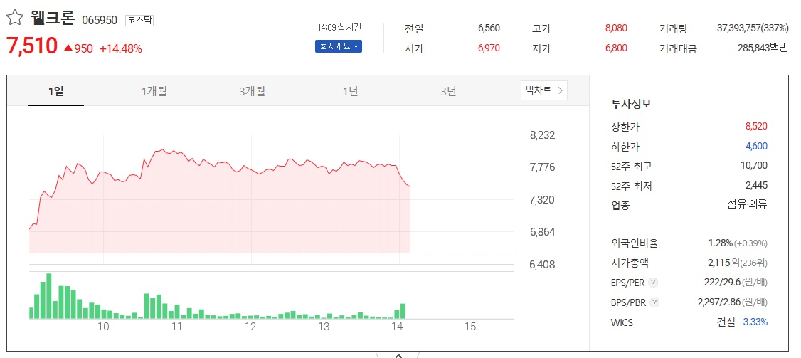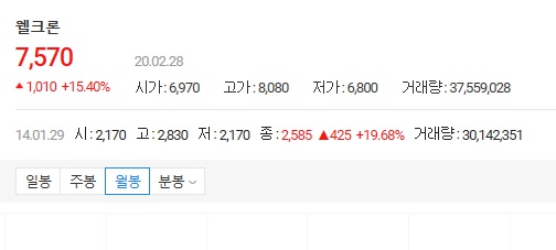 연일 상한가를 기록하며 성장세를 보이는 웰크론 주가지만 이번에 있었던 급락으로 웰크론의 한계점을 찾을 수 있었던 것으로 보입니다. 또한 안정적이지 못한 기업의 상황도 영향을 줄 것이구요. 그래서인지 일각에서는 코로나19관련 이슈가 끝난다면 웰크론의 주가는 다시금 원래의 규모를 찾을 것이라는 의견도 많이 나타나고 있습니다. 물론 현 상황에 대해 흐름을 잘 타고 나가며 재무를 안정적으로 관리해 나간다면 긍정적인 전망을 찾을 수도 있겠지만 현재로서는 부정적인 의견이 더욱 큰건 사실입니다.
