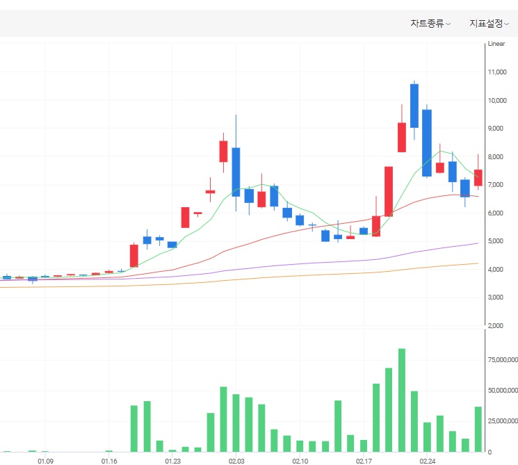 코로나19의 위협은 날이 갈수록 커지고, 신천지로 인해 크게 확산되면서 내 주변의 일이라고 생각하기 시작한 국민들은 공포감을 느끼게 되었습니다. 그리고 이런 흐름은 마스크 관련 테마주의 성장세에 큰 힘을 더하고 있었죠. 주가가 연일 상한가를 치면서 한동안 지속될 흐름을 보이자 거래량은 덩달아 급등하게 됐구요. 하지만 동시에 이런 거래량의 급등은 웰크론 주가의 성장세가 주춤하게 하는 원인으로도 작용했습니다. 만대의 고지를 눈앞에 두고 있던 웰크론 주가가 2월 24일 전날대비 18%가량 급락해버린 건데요. 코로나19가 아직 위협적으로 남아있고 계속해서 확산되고 있는 현시점에서 마스크 관련 테마주가 하한가를 칠거라고는 생각도 못했죠.