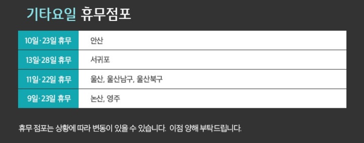 또 몇몇 매장들은 둘째주와 넷째주 일요일 혹은 수요일도 아닌 별도의 날을 휴무일로 지정하는 매장들도 있습니다. 홈플러스 울산, 울산남구, 울산북구점들은 모두 3월 11일과 22일에 휴무일을 갖습니다. 논산과 영주점은 3월 9일과 23일에 휴무일을 갖습니다. 서귀포의 홈플러스는 3월 13일과 28일에, 마지막으로 안산은 3월 10일과 23일에 휴무일을 갖습니다. 이처럼 다양하게 휴무일이 정해지기도 하니 자신의 애용하는 매장이 있는지 다시한번 잘 살펴보시기 바랍니다.