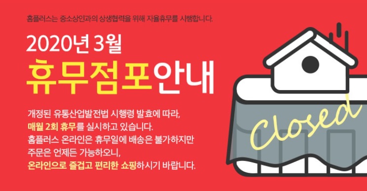 이와 같이 정해진 대형마트들의 정기 휴무일들은 왠만에서는 변경되지 않습니다. 정말 특정한 행사나 별도의 사건, 사고가 없다면 정기휴무일을 그대로 따라갑니다. 하지만 이번 코로나19가 바로 그 사고라고 할 수 있겠죠. 코로나 19로인해서 언제든지 휴무일이 바뀔수도 있으니 자신이 거주하고 있는 지역의 뉴스도 잘 살펴보셔야 할 것입니다. 그리고 그로 인한 휴무일 변동은 홈플러스 홈페이지를 통해서 공지가 되니 아래의 링크를 이용하시기 바랍니다.
