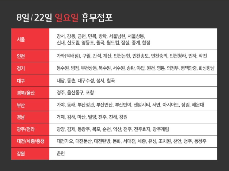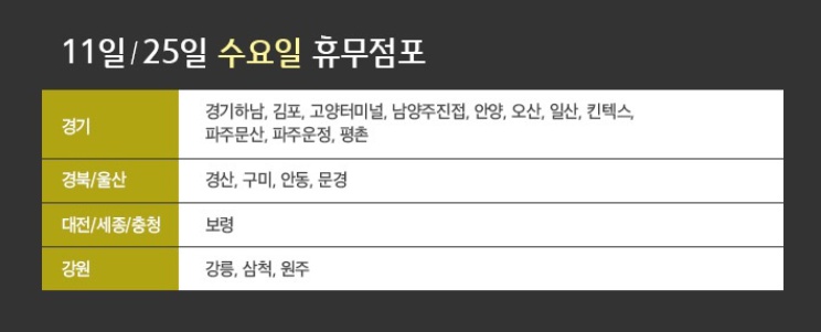 하지만 대부분의 매장이 그렇다는 것이지 모든 매장이 3월 8일과 22일에 휴무일을 갖는 것은 아닙니다. 몇몇의 매장들은 지역적 특성과 상황을 고려하여 3월 11일과 25일에 휴무일을 취하기도 합니다. 일시적으로 그런 경우도 있고 아예 정규 휴무일을 둘째주와 넷째주 수요일로 지정한 매장들도 있습니다. 경기의 하남, 김포, 고양터미널, 남양주진점, 안양, 오산, 일산, 킨텍스, 파주문산, 파주운정, 평촌점들은 모두 3월 11일과 25일에 휴무일을 갖습니다. 뿐만아니라 경산, 구미, 안동, 문경, 보령, 강릉, 삼척, 원주점들도 3월 11일과 25일에 휴무일을 갖습니다.