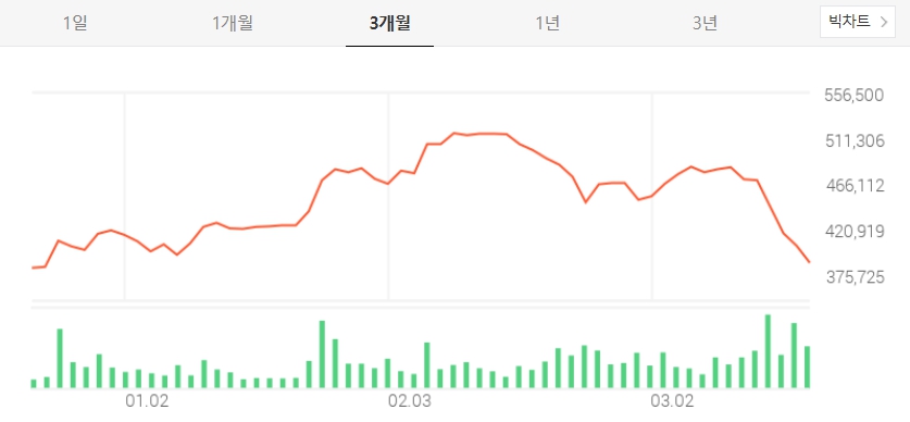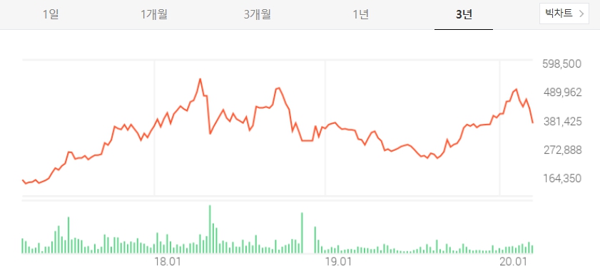 삼성바이오로직스 주가는 현시점(3월18일 11:00)으로 417,000원을 기록하고 있습니다. 1년중 최고가가 542,000원이고 최저가가 241,500원이었던 것을 고려해 본다면 정말 안정적인 성장세를 그리고 있다고 볼 수 있는데요. 마치 바이오 종목의 주식을 보는게 아니라 삼성종목의 주식을 보는 듯한 느낌이 들 정도로 제약기업의 특성이 덜 나타나고 있는데요. 바이오 관련 기업이라면 관련 이슈에 따라서 큰 폭으로 요동치는 게 평소 봐오던 바이오 기업의 흔햔 모습이겠지만 삼섬바이오로직스는 반대로 정말 안정적인 형세로 차근차근 우상향 그래프를 그려나가고 있습니다.