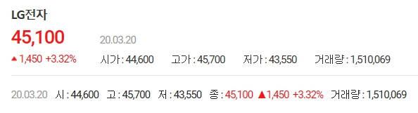 LG전자의 주식정보를 전달하기에 정말 적절한 단어는 ‘안정성’이라고 언급하고 싶습니다. LG전자에 대한 기관 투자자, 외인 투자자의 수급현황을 봐도, 일자별 등락률, 거래량, 재무제표 등 그 어느것을 살펴봐도 정말 안정적으로 우상향 그래프를 그리고 있습니다. 물론 몇일전 무려 8%에 달하는 주가 하락을 보여주긴 했지만 이 상황에 대해 LG전자의 안정성에 대해 불신의 시선을 보내는 이들은 없습니다. 코로나19의 영향력이 전 세계적으로 끼치고 있는 이상 LG전자에도 언젠가는 미칠 영향이었기 때문입니다. 이미 LG화학도 영향을 받았듯 LG전자도 코로나19의 영향을 받게 된 것입니다.