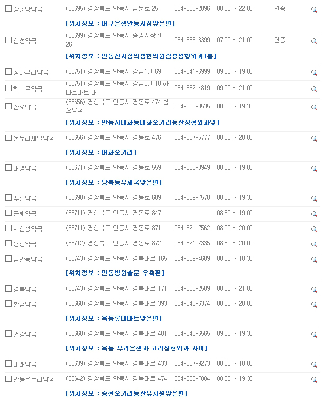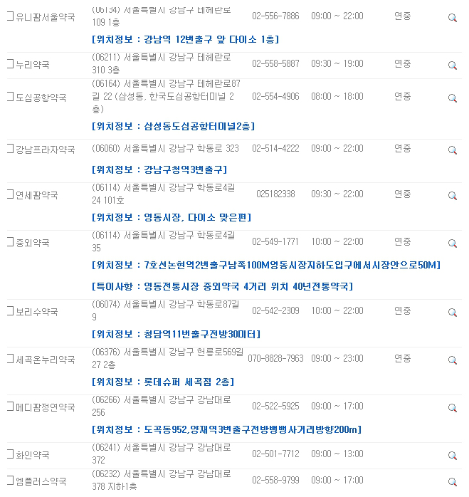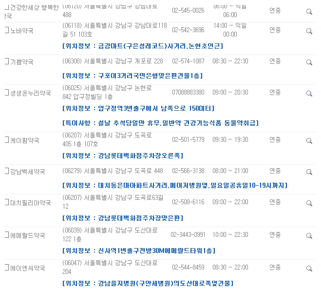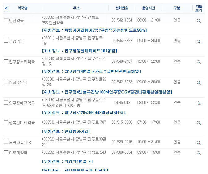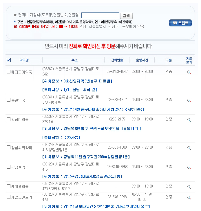 대부분의 약국은 오전 9시부터 오후 7시까지 운영되는 경우가 많습니다. 하지만 몇몇 약국들은 야간이나 연중무휴로 운영되고 있는 곳도 있습니다. 지도 검색을 통하여 근무예정 약국 목록을 보면 구분에 ‘연중’, ‘야간’, ‘연야’ 로 표시가 되었는 곳들이 보입니다. 연중의 경우 연중무휴로 운영시간에 근무를 하는 약국이고, 야간의 경우 밤 10시 이후로도 운영되는 약국입니다. 연야는 두가지가 모두 합쳐진 약국이라고 보시면 되겠습니다. 이렇게 휴일지킴이약국 조회 사이트를 통해서 우리는 약국의 운영시간을 알 수 있습니다. 하지만 약국마다 조금씩 운영시간이 다를 수 있으니 반드시 미리 전화로 확인한 후 방문하는 것이 좋습니다.