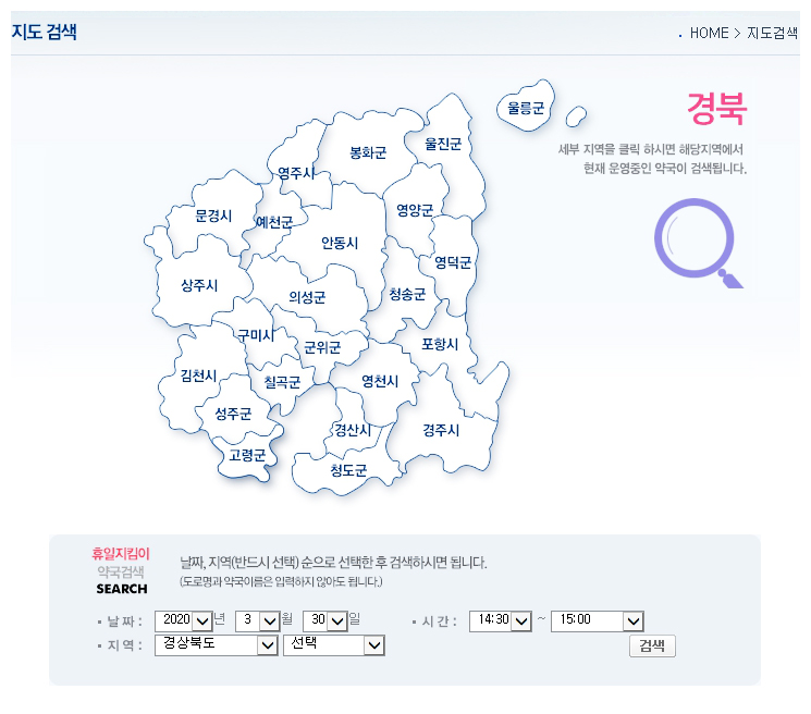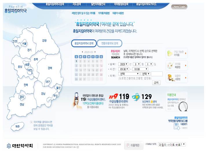여러분은 휴일지킴이약국을 아시나요? 휴일지킴이약국은 코로나 사태 이전부터 운영되고 있었습니다. 응급한 환자를 위해 공휴일에도 약국을 운영하는 서비스입니다. 휴일지킴이약국을 볼 수 있는 서비스 제공 사이트가 따로 있습니다. 바로 www.pharm114.or.kr 입니다. 휴일지킴이약국 확인 방법은 우선, 홈페이지에 처음 들어가시면 우리나라 지도가 뜨는데요. 본인이 조회하고자 하는 시도를 클릭하면 해당 지역 내에 운영 중인 약국을 전부 볼 수 있습니다. 지도 밑 검색창에 도로명 주소나 건물 번호, 동명을 입력하면 더 좁은 범위의 주변 약국을 확인 할 수 있습니다.
