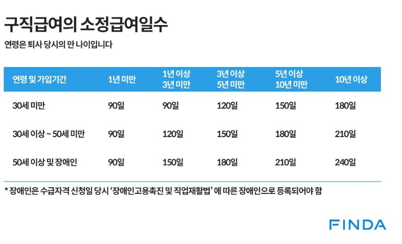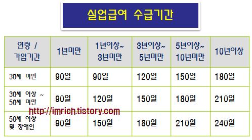 이와 같은 조건들에 해당하여 실업급여를 지급받게 된다면 이 또한 영구적으로 지급받을 수 있는 것은 아닙니다. 고용노동보험에 가입되어 있던 기간과 실업한 근로자의 연령을 고려하여 90일에서 240일동안 실업급여가 제공됩니다. 최소 30세 미만이며 1년 미만의 고용노동보험가입 기간을 가지고 있는 경우 90일간 실업급여가 지급되며 최대 50세 이상이며 10년 이상의 고용노동보험가입기간을 가지고 있는 경우 240일간 실업급여가 지급됩니다.