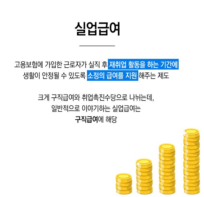 실업급여라고 하면 고용보험에 가입되어 있는 노동자가 실직 이후에 보다 안정적으로 재기의 기회를 엿볼 수 있도록 활동하기 위한 급여를 작게나마 지원하는 제도입니다. 실업급여의 종류에는 구직 급여, 취업촉진 수당, 연장급여, 상병급여 등의 4가지로 구분되어 있습니다. 실업에 영향을 준 것이 개인의 사정이나 중대한 자기 잘못으로 인한 경우에는 실업급여의 대상자에 해당하지 않습니다. 어디까지나 타의에 의해, 자신의 업무적 능력에 이상이 없으나 근로자를 고용한 측의 사정에 의해 실업상태에 이를 근로자들을 구제하기 위한 제도라고 생각하시면 좋을 것 같습니다.